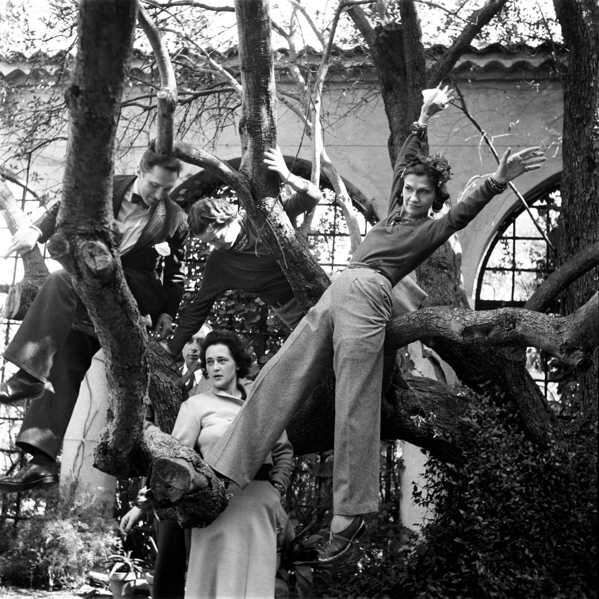 香奈兒女士與名流好友攀爬於 La Pausa 故居的一棵樹上,攝於1938年。