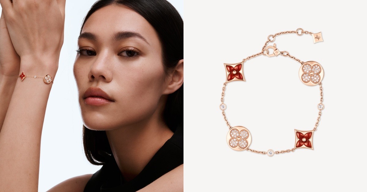 Louis Vuitton 的 Color Blossom BB Multi-Pattern 手鍊,則將紅玉髓演繹得大膽而摩登。四朵 Monogram 花卉圖案在18K玫瑰金鏈帶上綻放,鑽石與紅玉髓交錯鋪陳,猶如煙火於腕間綻放。每顆紅玉髓皆以手工拋光處理,工藝細膩到如絲綢般的觸感。它不僅是一件珠寶,更是一份時代的標誌,既能呼應節慶氛圍,又是值得投資的時尚臻品。(價格 NTD 328,000)