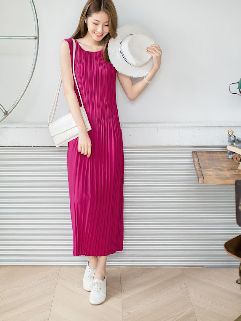1.唯美純色立體百褶壓紋無袖長洋裝