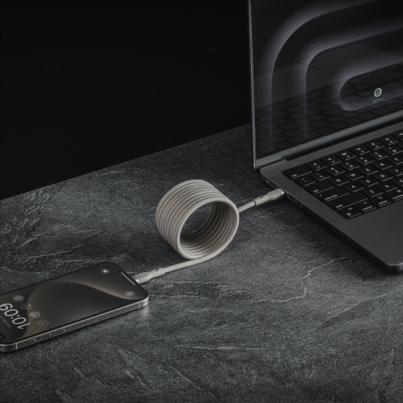 亂糟糟的線材真的很惱人,但這款 MAGEASY iPhone 17 快充線內含磁粉,能自動吸附成線圈,收納起來可以超級整齊。外層採用尼龍編織,耐用度提升,可承受五萬次彎折,還支援 60W 快充與 480Mbps 傳輸速度,是一款兼具充電速度與收納功能的快充線。