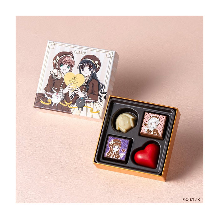 4入裝的禮盒當中,有《庫洛魔法使》的木之本櫻(以下稱:小櫻)、大道寺知世(以下稱:知世)兩位角色的造型巧克力登場,並附上一個白摩可拿的造型巧克力,與一個愛心形狀的巧克力。禮盒上面的插圖,還是這次聯名合作特別新出的主視覺,非常值得留下來好好收藏呢~