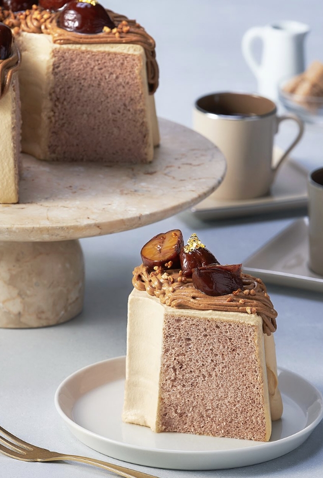 糕體為可可亞口味,蛋糕上頭則以栗子果實點綴,並配上焦糖味的鮮奶油來引出栗子的香甜。香甜不澀的栗子、略帶些許苦味的焦糖鮮奶油,與甜而不膩的可可亞糕體,三者碰撞出優雅的秋日風味。