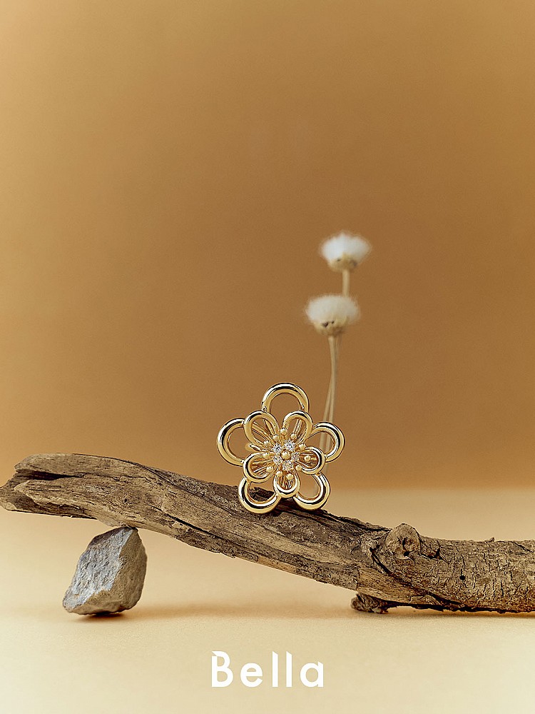 一枚戒指,簍空設計微微透出指間肌膚的溫潤觸感。世家工匠結合多種工藝,將花卉的活潑氣息化為細緻設計。製作過程中,先以蠟雕模型塑形花卉圖騰,透過傳統的脫蠟鑄造法,將熔化金屬注入模具中,形成金質結構。金屬冷卻後,工匠們以手工細心潤飾、鑲嵌寶石並打磨拋光,讓戒指最終呈現出立體而閃耀的花朵造型,彷彿花朵在指間悄然綻放。