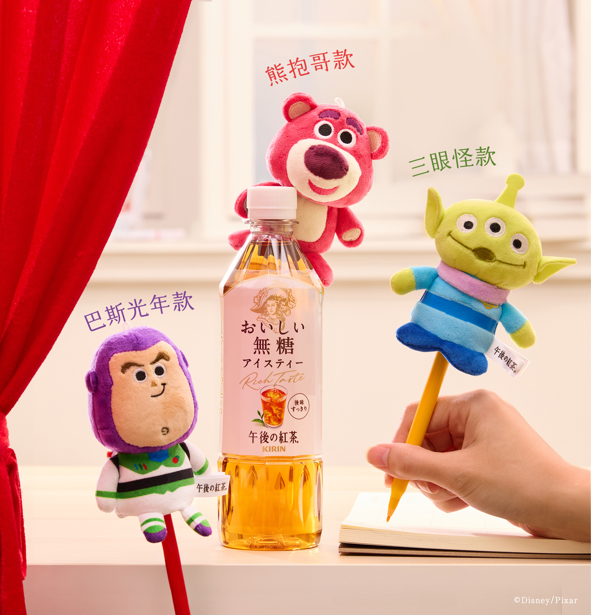 迪士尼皮克斯經典動畫《玩具總動員》邁入30週年,今年台灣麒麟(KIRIN)旗下人氣茶飲品牌「午後の紅茶」將童年好友帶進瓶中,讓幸福與回憶悄悄裝進每一個午後時光。為慶祝這段跨世代的童趣回憶,「午後の紅茶」特別推出限量《玩具總動員》「瓶中娃娃」聯名套組,集結人氣角色「抱抱龍」、「胡迪」、「巴斯光年」、「熊抱哥」與「三眼怪」,分別搭配濃厚「午後奶茶」與清爽「無糖紅茶」,即日起於7-ELEVEN限定開售,邀請大眾一起開場超萌茶會!