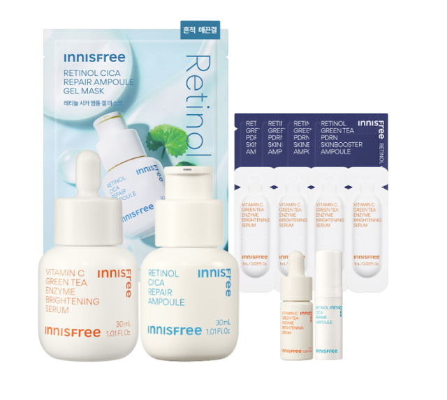 innisfree 早C晚A戰痘穩膚組是專為敏感肌與痘痘肌設計的溫和入門保養組合。A醇安瓶濃度僅 0.015%,搭配積雪草萃取與多種保濕成分,能有效代謝老廢角質、改善粉刺並緊緻毛孔,質地為水狀精華,清爽不黏,敏感肌連續使用一周都零泛紅。維他命C精華則採用維他命C與綠茶酵素結合的獨創金球膠囊科技,不僅提升肌膚透亮度,也能瞬效拋光,讓你素顏也能充滿光澤!