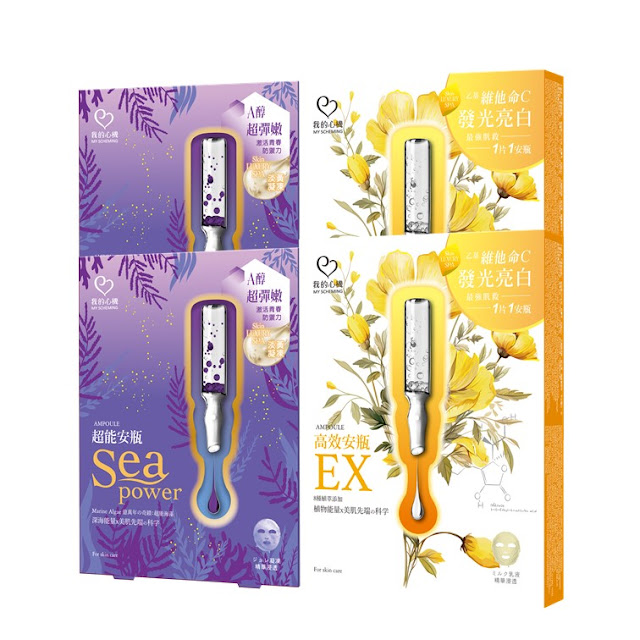 【我的心機】早C晚A安瓶面膜組打造高效美白與修護雙重功效。白天的「高效乙基C光燦煥白面膜」採用安瓶濃縮技術,將維他命C、熊果素與11種植物萃取以及瑪乳拉果油、印加銀曲果油融入高滲透凝乳精華,改善暗沉、提升亮度。夜間的「超能A醇賦活青春面膜」則含0.3% A醇,搭配海洋萃取與高效凝凍安瓶滲透技術,鎖住水分、修護肌屏障,減少細紋、強化肌膚彈性。