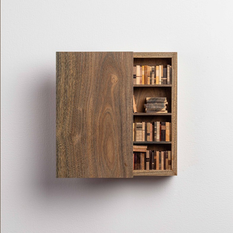 以多種木材製作微型書櫃、課桌椅與書冊,邱懷萱結合動力機構,讓物件緩慢移動、碰撞、轉換;「控制/不可控」在循環中互相生成。藝術家保留木紋與色澤,像把樹木的年輪時間封存於抽屜與書背的縫隙裡。微觀結構開啟宏觀敘事:一座「書牆即森林」的隱喻,觀者在啟合之間閱讀記憶與時間。