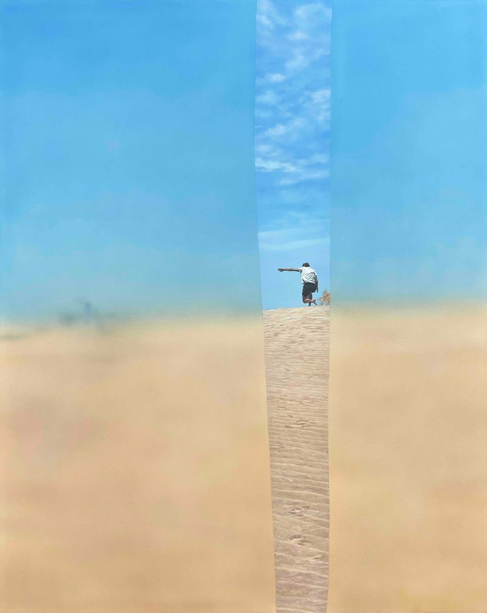 英國藝術家 Charlotte Keates以「入口」為母題,以門、窗、廊道與圓形結構導引視線穿越室內外。她擅長並置實體物件與倒影、陰影等「虛實元素」,使空間在秩序與想像間流動。作品延續其近年與時尚品牌合作的空間語彙:嚴謹構圖下藏著有機溫度,觀者被邀請於視覺噪音中自行拼組生活片段,完成屬於自身的場景敘事。