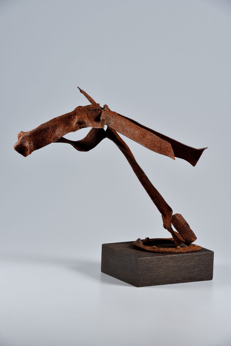 林良材以生鐵、銅為材,透過敲擊、切割、燒灼、扭轉與焊接,將金屬表面鍛成猶如筆觸的肌理。作品以簡鍊線面牽引量體轉折,藉局部軀體姿態暗示情感與精神張力。金屬氧化的時間痕跡成為作品一部分,彷彿與生命角力的印記,讓「聆聽」化為對內在迴音的感官雕塑。