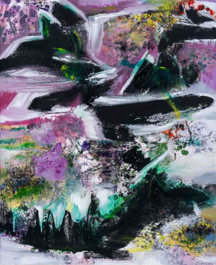 王淑鈴的大尺幅抽象,以富流動性的筆觸與層層疊色,構築出帶有「複空間」感的東方山水。不同於西方的純視覺風景,她將東方「感知性」與內斂情緒轉化為皴法般的肌理,將回憶、土地與時間沉積於畫面。抽象與寫實、東方與西方在此交會,像是對「家」與自身碎片的再建構,亦是對生命軌跡的刻寫。