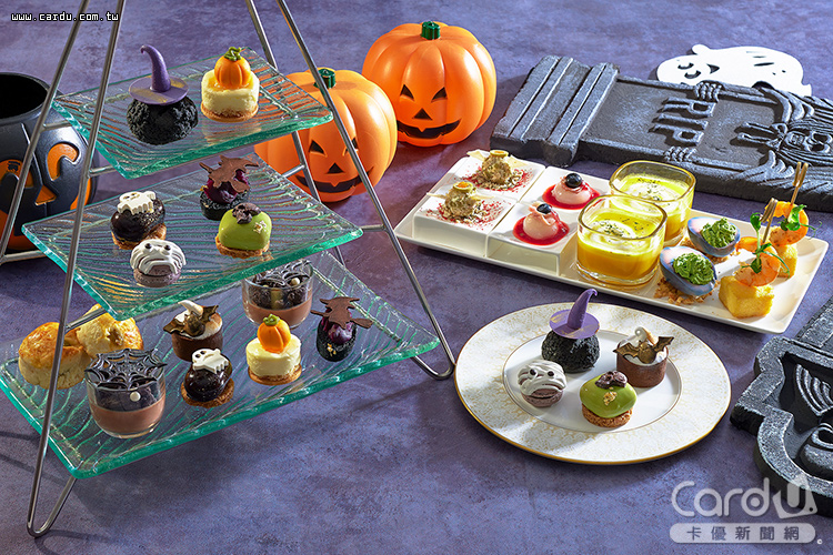 其中,品頌坊以南瓜、楓糖、巧克力、薑汁、榛果及覆盆子等秋季食材,結合法式技法打造南瓜堅果歐培拉、楓糖南瓜派(傑克南瓜)、南瓜白巧克力慕斯(厄夜蠟燭)、焦糖巧克力慕斯(血紅骷髏)等6款甜品。月台町萬聖下午茶則有菠菜魔鬼蛋、南瓜子起士球、骷髏造型的開心果櫻桃慕斯等鹹甜點,加上中、西、日式茶款或咖啡任選,雙人下午茶套餐售價1,480元。