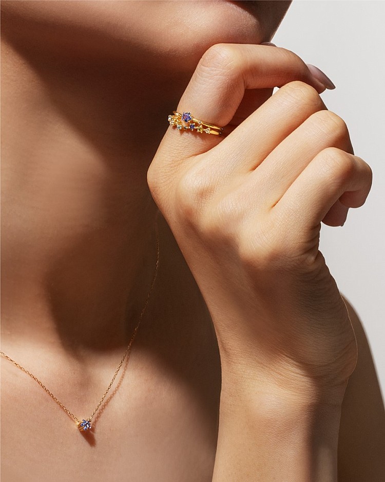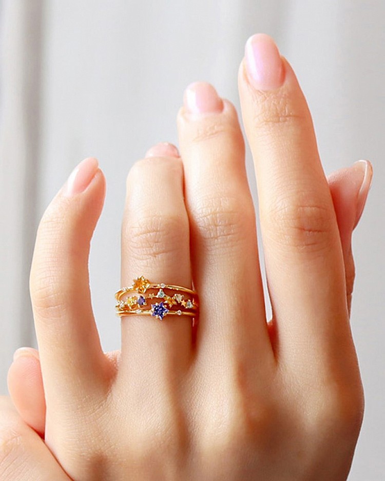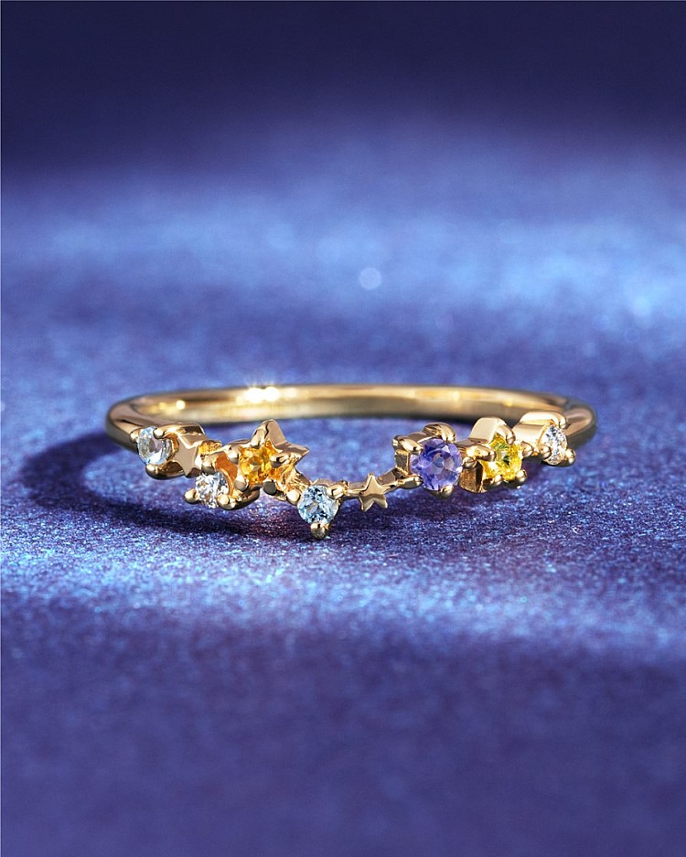 戒指佳作鑲嵌七顆寶石:黃水晶、海藍寶石與鑽石交織出層層光澤,如夜空中綿延的銀河閃耀流轉。無論單獨配戴或層疊搭配,都能綻放出專屬於你的星光風格。