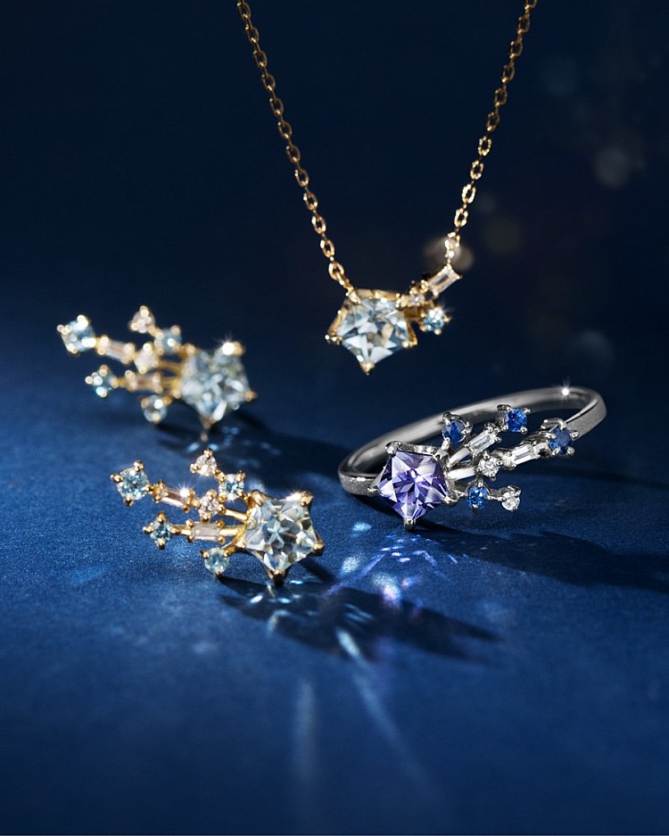 主石「坦桑石」與「藍色托帕石」經特別切割,乍看為五角形,卻在光影流轉間綻放星辰般的光芒。長方形切割的白色托帕石勾勒出流星的軌跡,與圓形鑽石交織閃爍,宛如夜空中劃過的耀眼流星。無論是盛裝時分、或日常時刻,此系列都能展現自信且柔美的氣質。