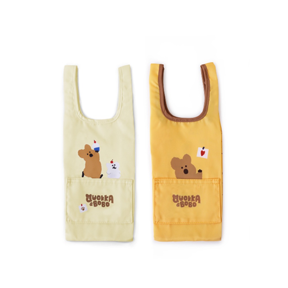 出門常常想來杯手搖,多買一個塑膠袋既花錢又不環保,準備一個飲料提袋放包包,省錢又兼顧環保愛地球!這組Dinotaeng雙耳飲料袋可愛又好用,一體成形的設計,很耐裝、提把也比較不容易斷掉。收納方便,摺好放進前方的小袋子,既輕巧體積又小,放包包完全不佔空間!雙面都有Dinotaeng圖樣,提在手上超可愛~~