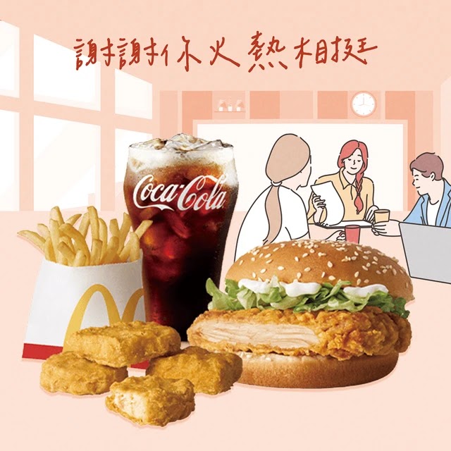 想要一份簡單卻暖心的感恩小禮?麥當勞的「麥心意」火熱相挺套餐,用勁辣雞腿堡、雞塊、薯條和可樂組成最療癒的組合。送給那位總是陪你熬夜加班、一起叫外送解饞的朋友吧,一張券就能立刻兌換到感恩節的快樂時光。