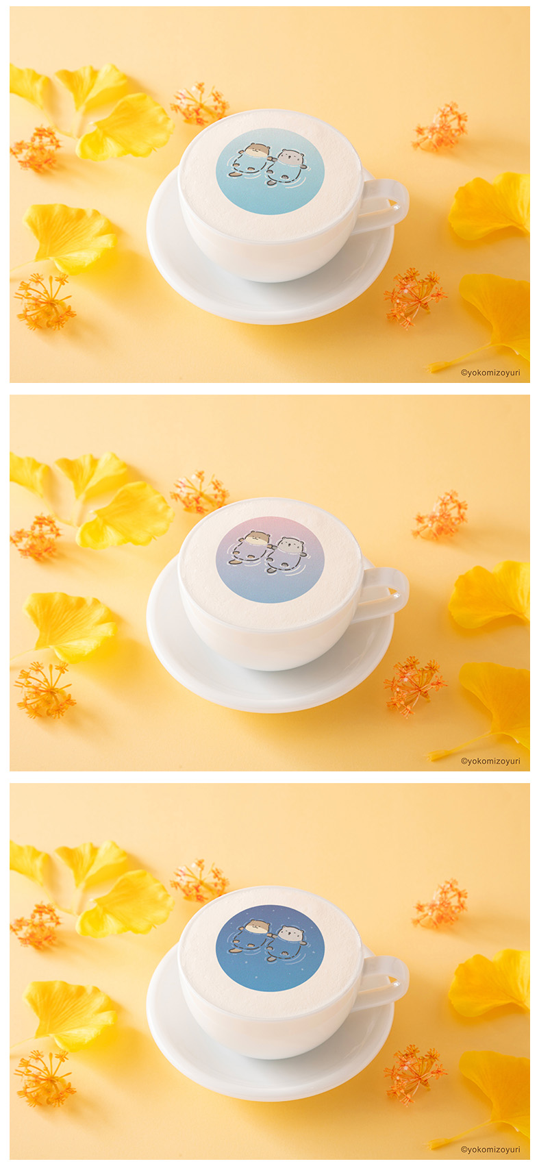總共有三種不同拉花款式的咖啡,在拉花圖案上登場的角色是海獺與水獺(ラッコとカワウソ),在作品當中他們可是非常親密的夥伴喔!而拉花圖案則依照背景的不同,分成在白天漂浮的海獺與水獺、在日落漂浮的海獺與水獺、以及在夜晚漂浮的海獺與水獺,款式無法挑選,是隨機分配。