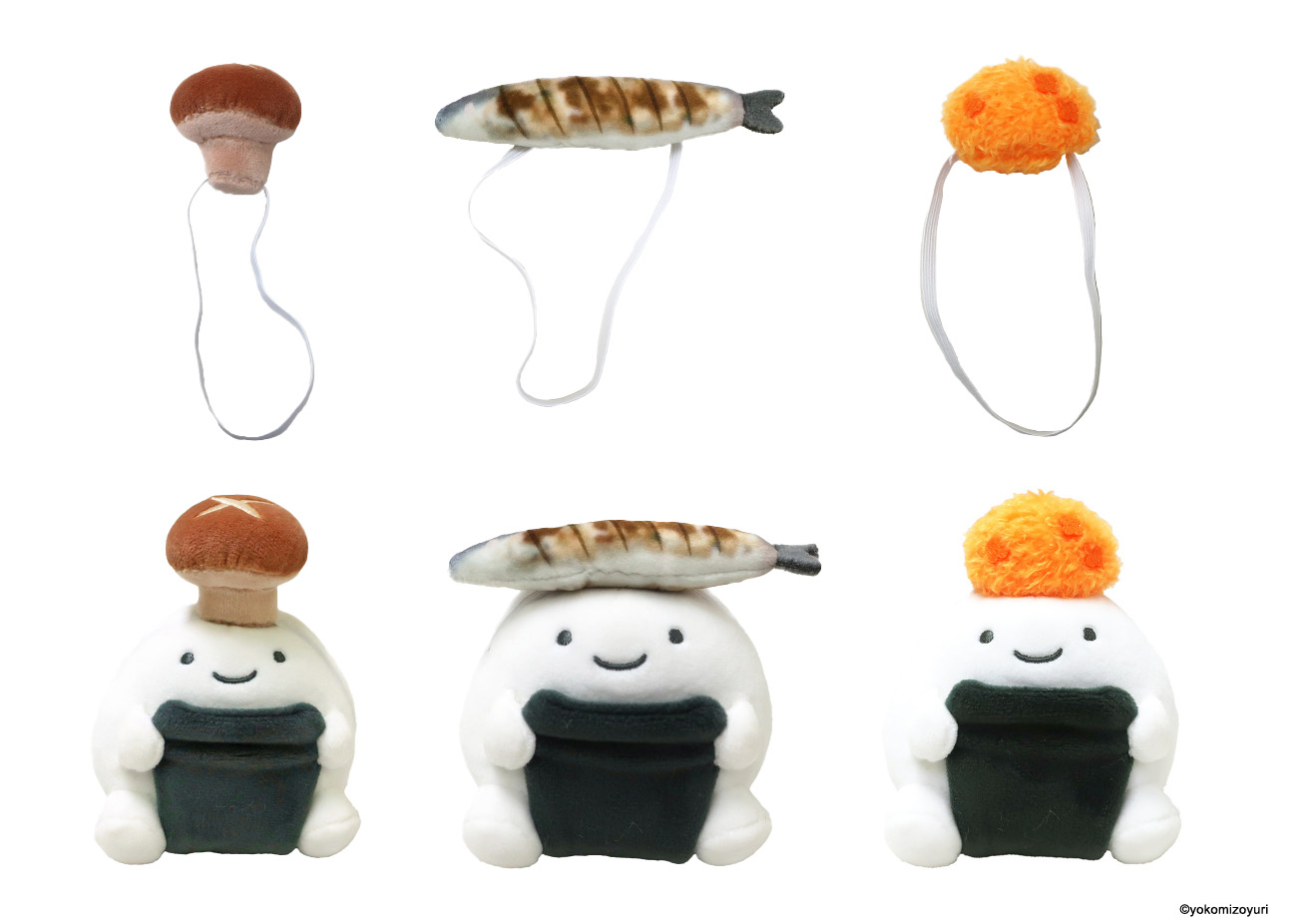 有趣的是,甚至還有販售給玩偶配戴的娃用造型頭飾喔!有香菇造型、烤魚造型、金木犀造型等,適合配戴的玩偶為朗萌綺盟NANDEMO IKIMONO 官方所推出的小型玩偶(S),照片上的示意圖則是以一般版的海苔飯糰小型玩偶(S)來做示範,而以上所介紹的三款咖啡廳系列玩偶也同樣能夠配戴。