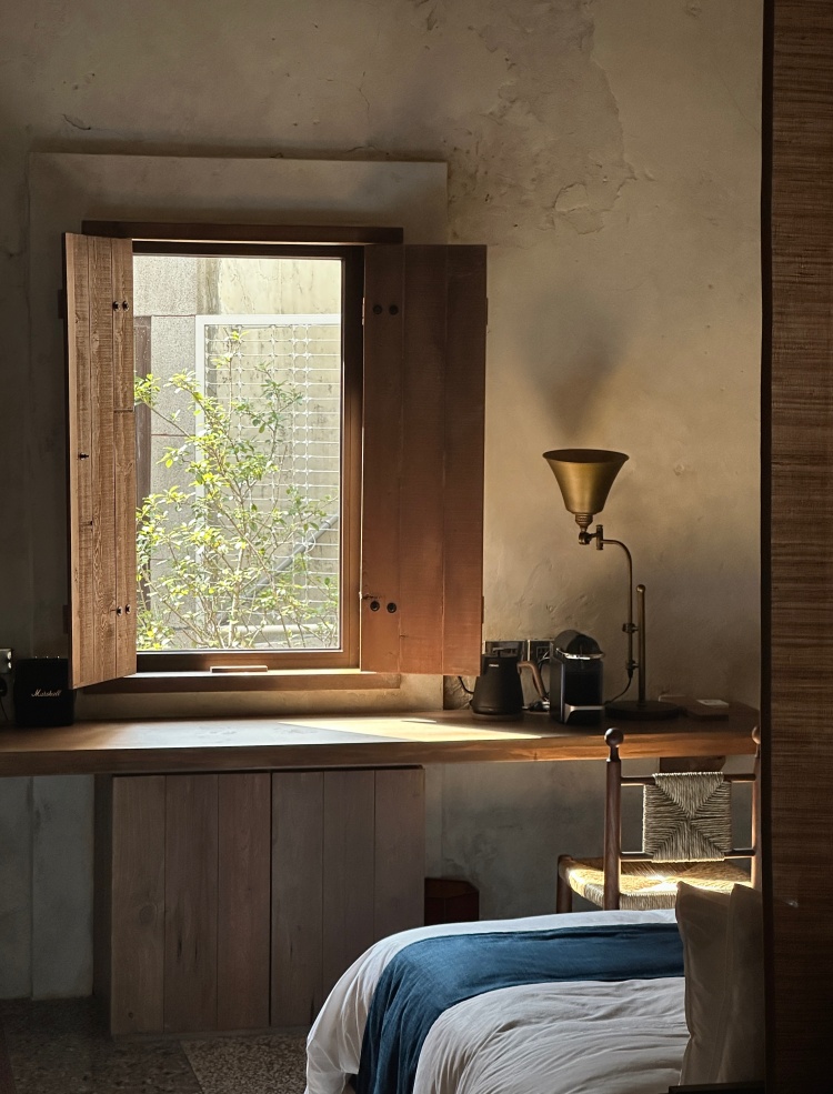二、采風棟:前身是阿嬤的起家厝,如今被轉化為旅人交流的家常場景。一樓作為開放的社交中介空間,舊宅的煙火氣被保留下來,與中庭綠意互相呼應。木心棟:保留九宮格立面,像一面懸掛於記憶中的空間相框,成為全棟視覺識別的亮點。木質線條的比重加重,使舊屋的溫度得以再次被感受。