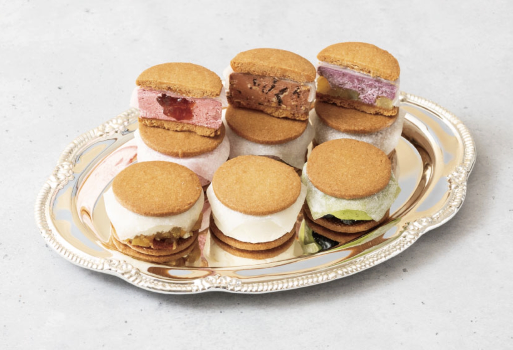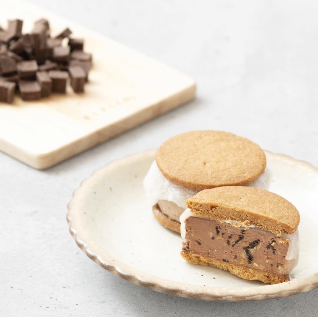 秘密就在於店家在夾心餅乾加入了一個讓人意想不到的餡料,那就是日式和菓子「大福」一定會使用到的「大福皮」(求肥),在奶油餡料當中放上一塊大福皮,最後用餅乾將奶油餡料與大福皮一同夾住,創作出和洋融合的新口感。