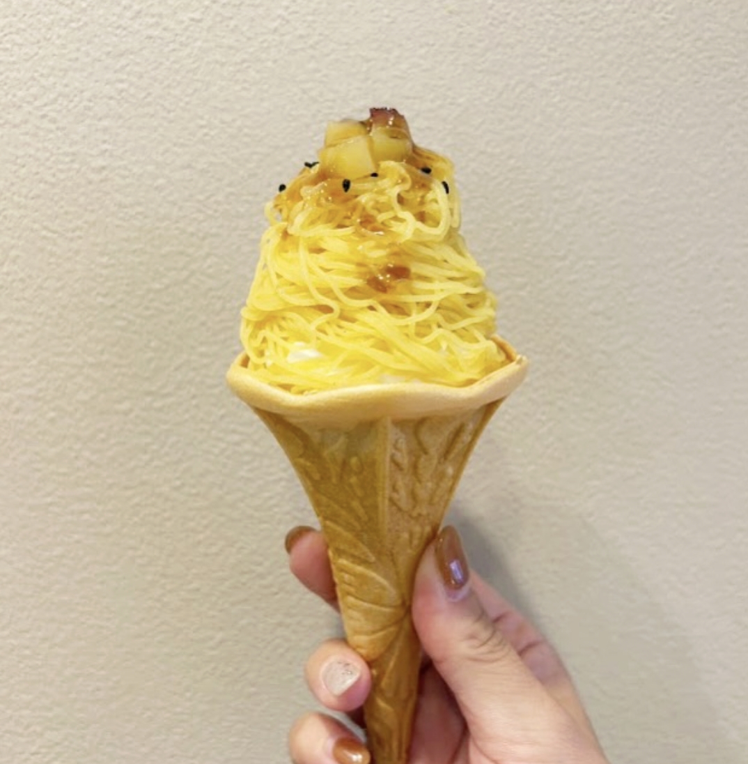 另外一款則是地瓜蒙布朗霜淇淋,在霜淇淋上鋪上滿滿的地瓜鮮奶油,打造出如同蒙布朗一樣的風味口感。