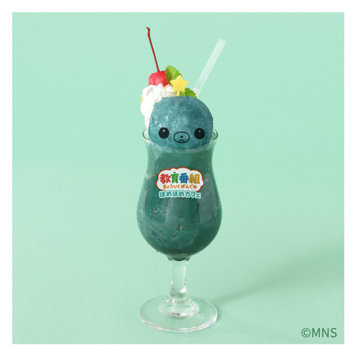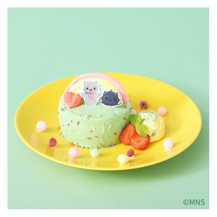 最後一款甜點則是開心果奶油蛋糕,旁邊有一球香草冰淇淋。而這款蛋糕上面所點綴的角色則是教育番組當中也曾登場過的角色,叫做「高麗菜」(キャベツ)和「玉米」(コーン),這兩個角色做著一份名為「誇誇屋」(ほめほめやさん)的工作,專門誇獎、讚美對方來治癒顧客。