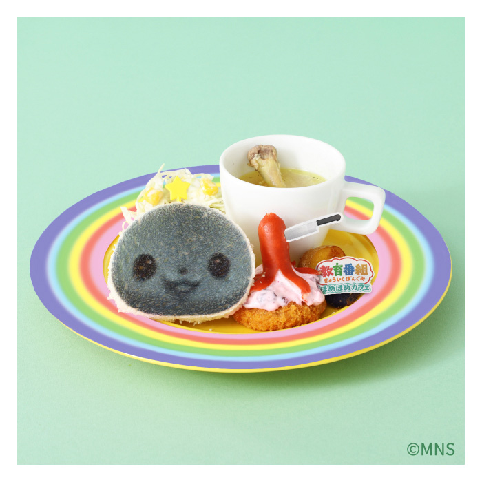 而這道特製餐盤,裡面則吃得到印有TAMA造型的麵包、被一刀刺中的章魚小香腸、炸鮭魚、玉米濃湯與生菜等,而這道菜還特別使用了教育番組當中常出現的彩虹圈圈背景的造型盤子來擺盤。(這道菜只在大阪場提供,名古屋場不提供)