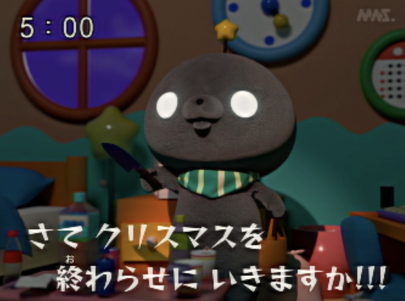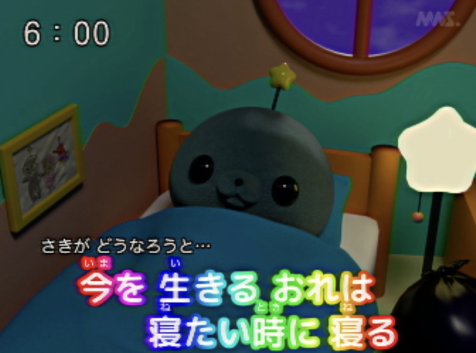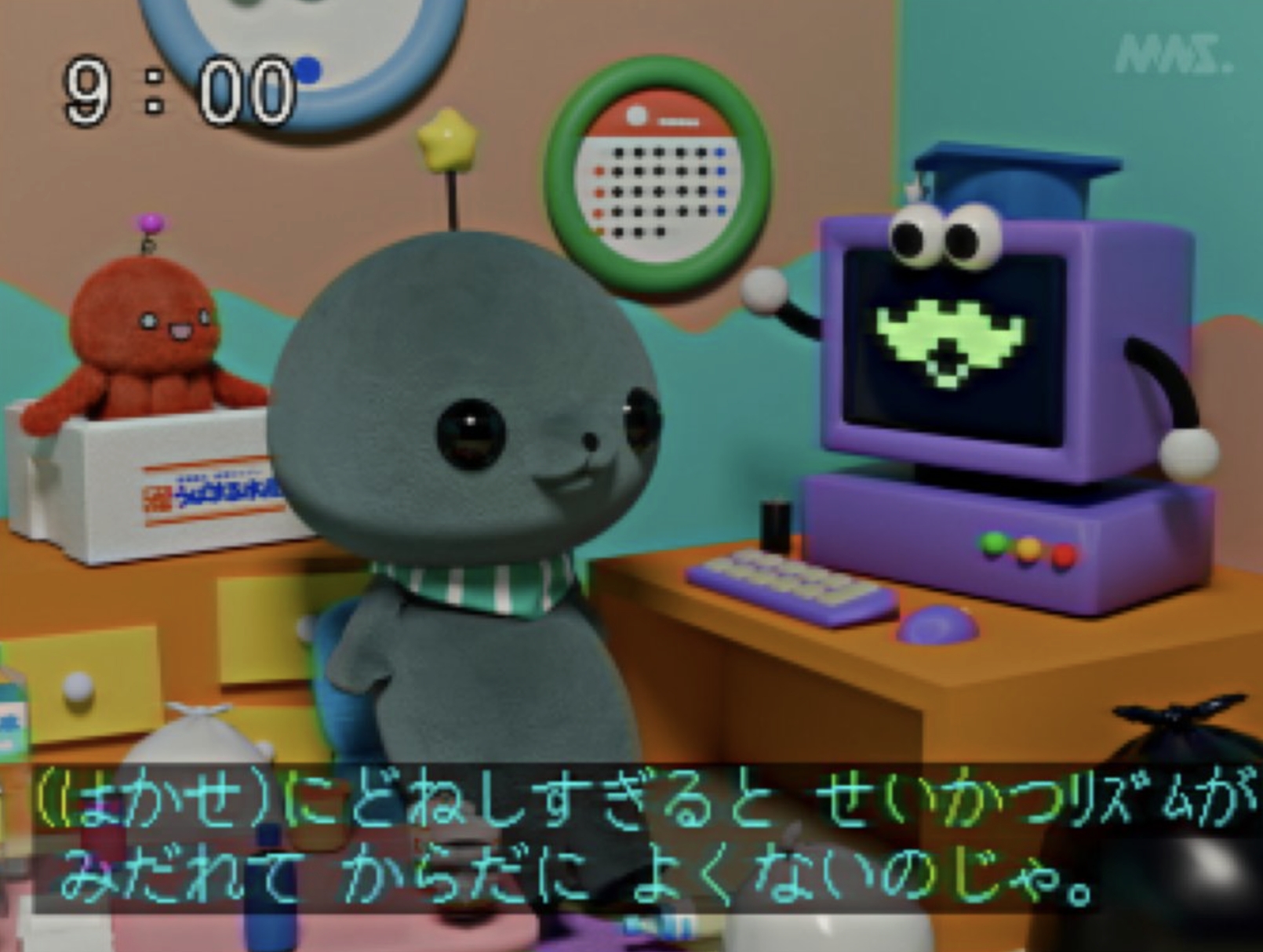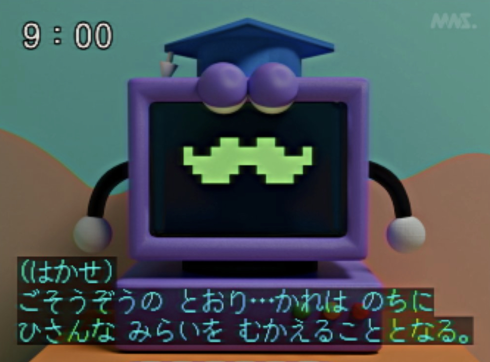 看到這個畫面,是不是有種早期教育節目的既視感呢?但其實這個「教育番組」並非實質上存在的節目,而是以模仿早期教育節目畫面的手法,創作而成的短篇動畫故事,此動畫故事題材的創作者為「ももにくす」,簡稱為「MNS」,如果仔細看的話,還能在畫面中發現到「MNS」的浮水印LOGO,看起來就像是一般觀看電視時會出現在節目右上角的電視台 Logo,十分有趣。