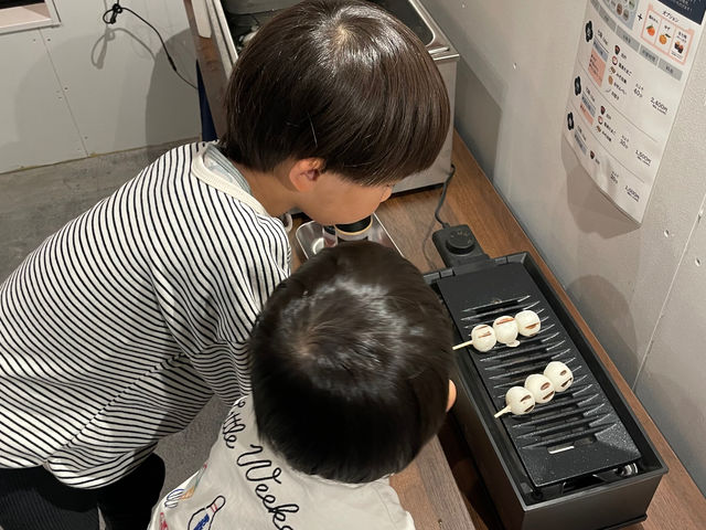 將米餅糊倒入烤盤親自烘烤,刷上醬油再撒七味。 熱騰騰、帶焦香+七味的香氣衝上來,一口就幸福感爆表。