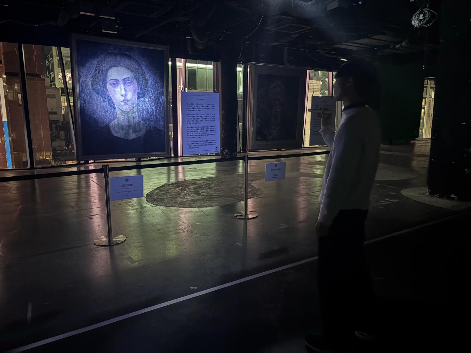 在黑暗之中,能以比白天更近的距離直面畫作,正是本活動獨有的體驗。入場需手持手電筒,在寂靜無聲的展示空間中前行,透過光線照射畫作,更強烈地感受到那種「明明白天看過的作品,到了夜晚卻彷彿完全不同」的違和感與恐懼,這是一場極具實驗性的夜間觀展企劃。