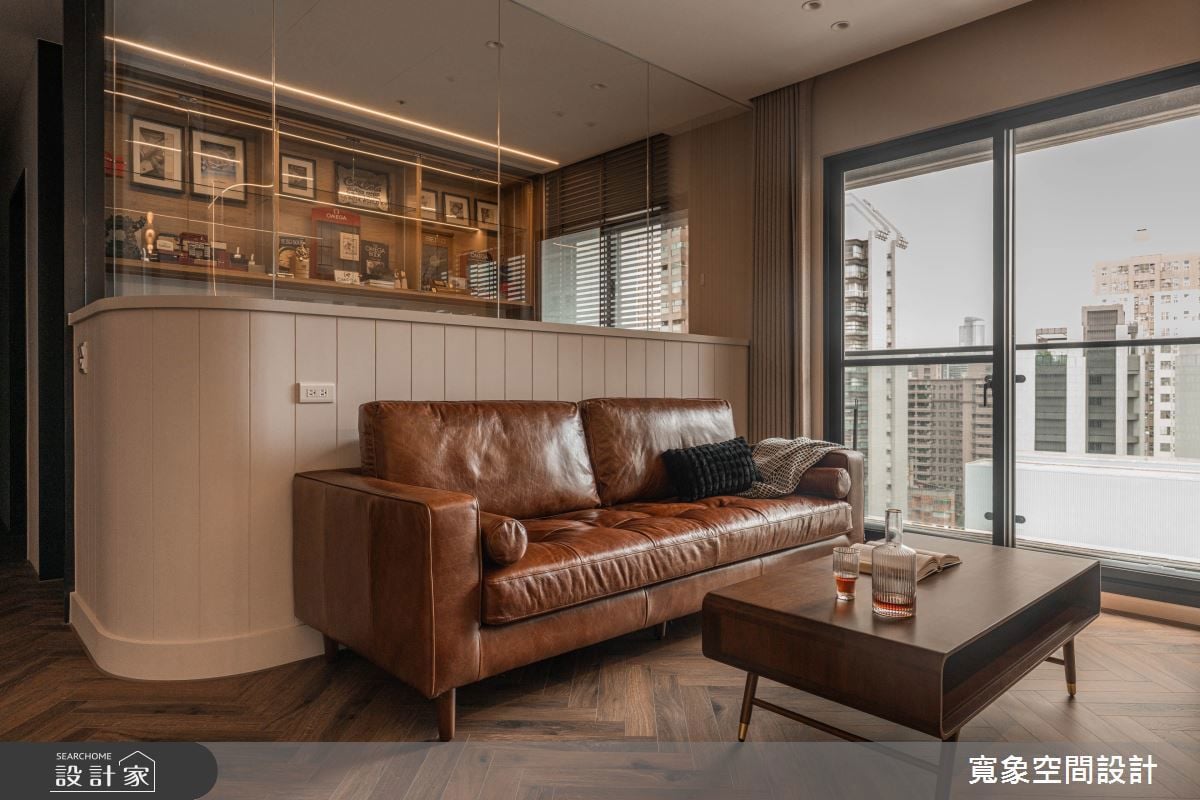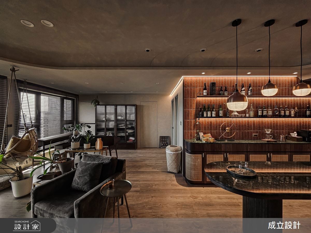 20 坪住宅以開闊的無隔間設計致敬歐美住宅的自由靈魂,餐飲區則是這場美學實驗的視覺核心,完美復刻了風格酒吧的微醺氛圍。酒櫃牆面鋪設暖色調的赭褐色鐵道磚襯底,搭配內嵌燈帶的鐵件層架,展示出優雅的藏酒品味;下方的吧台檯面則延伸自餐桌的復古綠色大理石,弧形倒角與藤編櫃門的細節,在黃銅吊燈的映照下,更顯精緻且富有年代感。公領域隨處可見的復古家具,如絨布主人椅、玻璃展示櫃,在沉穩中流露出一抹隨性的時髦氣息,將厚實材質與輕盈動線混搭的手法,成功讓現代住宅搖身一變成為兼具設計感與生活溫度的美式復古場域。