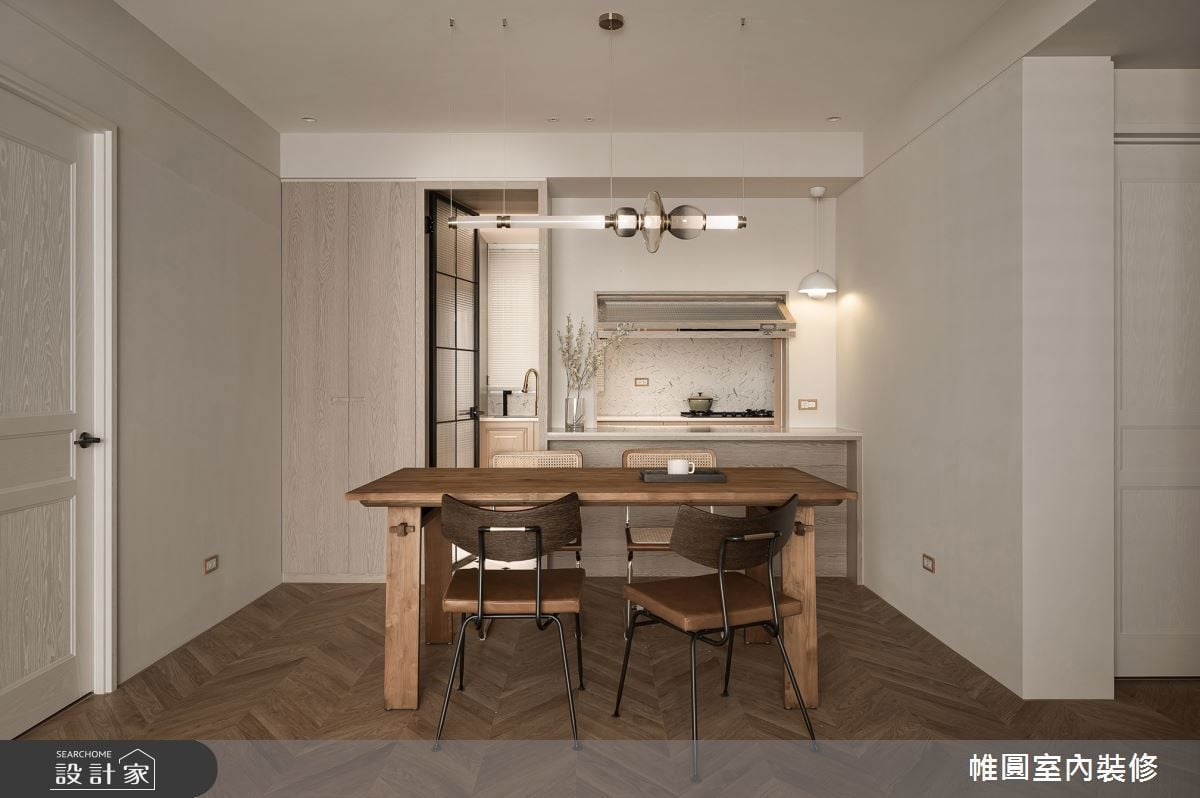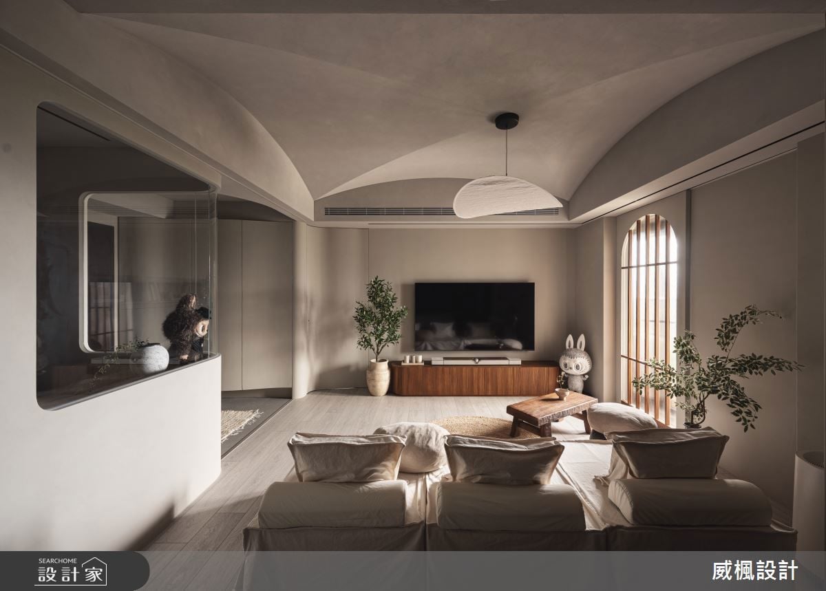 這間30坪住宅深度實踐了「侘寂 Wabi-Sabi」中師法自然的理念,公領域鋪陳大面積的米白色礦物塗料,透過手工感十足的特殊塗料基底,與石材電視牆形成異材質拼接,在低度裝飾中堆疊出內斂的前後景深。善用弧形線條與留白美學,將視覺壓力降至最低。家具配置強調整體性的材質呼吸感,實木長桌、長板凳與餐椅的搭配在沉穩中流露隨性美感;軟裝具備手工溫度的藤編元素與格柵立面,復刻出具備時間厚度的侘寂復古神韻。