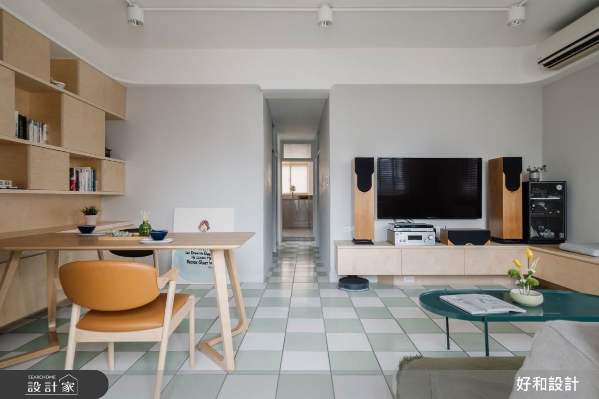 台式復古的核心在於「親切感」。在 50-70 年代的台灣建築語彙中,老花磚與窗框是靈魂。現代設計巧妙地將早期常見的綠白相間老花磚重新鋪設於客廳地坪,不僅在視覺上劃分出鮮明的空間感,更在步伐間踏出了兒時巷弄的懷舊節奏;搭配現代極簡的木質電視櫃與俐落的嵌燈設計,成功消弭了老元素的厚重感,讓空間顯得清爽卻富有故事。