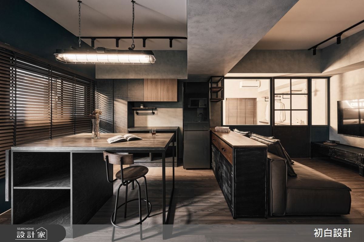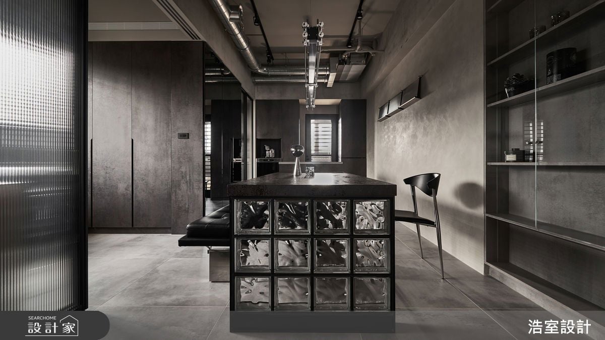 35坪新成屋為硬派工業風的精隨,空間大膽捨棄繁瑣裝修,改以原始感十足的水泥塗料鋪陳立面,在黑白灰色的冷調基礎上,奠定沉穩且具藝術張力的基調。天花板別具匠心地保留了天花板明管設計,銀色金屬管線與俐落的黑色軌道燈相互交織,不僅拉高了視覺尺度,更復刻出紐約閣樓般的原始秩序感。為了平衡工業風的粗獷,空間巧妙挹注鐵件與玻璃磚進行材質對話。餐廚區的中島底座特別鑲嵌通透的玻璃磚,在後方燈光的映照下,折射出波光粼粼的夢幻質感。集結了粗獷基質與精緻光影的復古實驗,不僅滿足了機能需求,復刻紐約蘇活區的摩登工業日常。