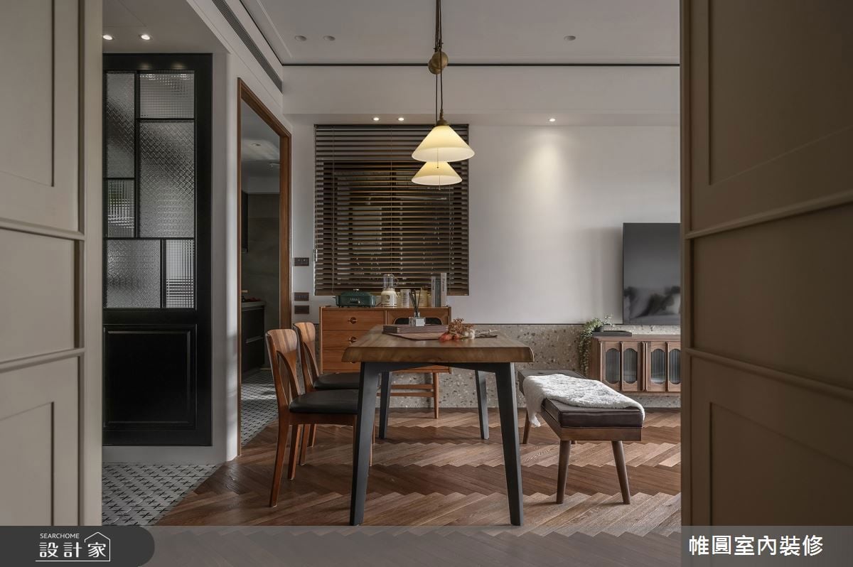 30 坪的老屋改造中,設計師以「傳承」為核心,將台式建築經典與現代手法精妙融合。廚房區域最具巧思,選用傳統灶咖常見的上下折疊窗取代一般窗型,搭配壓花玻璃特有的朧朦光影;引入具法式工業感的黑鐵框玻璃拉門,與室內的人字木地板相呼應,讓台式復古的質樸與法式的俐落鋼感在同一個場域內和諧共生。餐廳選用帶歲月的老件皮革餐椅與藤編單椅,不僅坐感溫潤,更賦予空間厚實的生活溫度;上方懸掛的復古玻璃燈具,透過新設計型態延續了舊時光的照明美學。