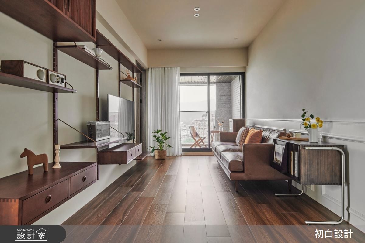 這間13.5 坪的小宅玄關落塵區鋪設的水磨石地磚瞬間喚醒了老建築的記憶,與溫潤的藤編鞋櫃、鐵件支撐的木質長凳交織出一種樸實的儀式感。牆面上妝點的台式花磚,它化身為迷人的端景屏風,在現代俐落的動線中,巧妙地將新成屋轉化為帶有文青底蘊的時光空間。公領域是復古元素與現代感的完美融合,電視牆兩側的木製層架結合黑色鐵件,在視覺上顯得現代輕盈,卻又呼應了整體的仿舊質感。