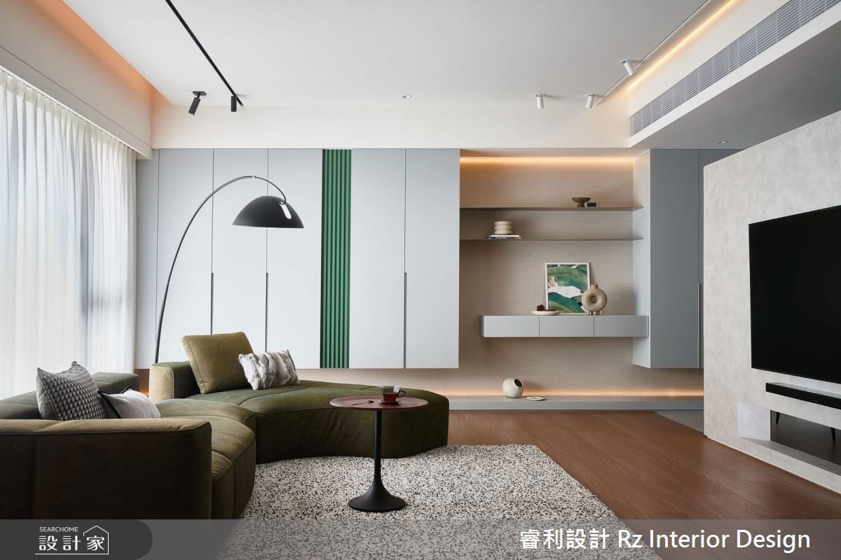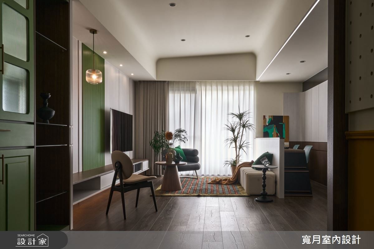 51.6 坪的空間以包浩斯(Bauhaus)精神為核心,透過俐落的幾何線條與「形隨機能」的解構手法,重新定義復古與現代的比例美學。公領域大膽選用帶有有機曲線的墨綠色沙發,與簡約的灰調牆面形成色彩對比,配以造型俐落的黑色設計立燈,在流暢的空間格局中勾勒出從容的摩登氣息;大面積的暖色木質地坪與自然採光交織,不僅消弭了現代主義的冷冽,更透過異材質的層次堆疊,築起極具個性的復古端景。