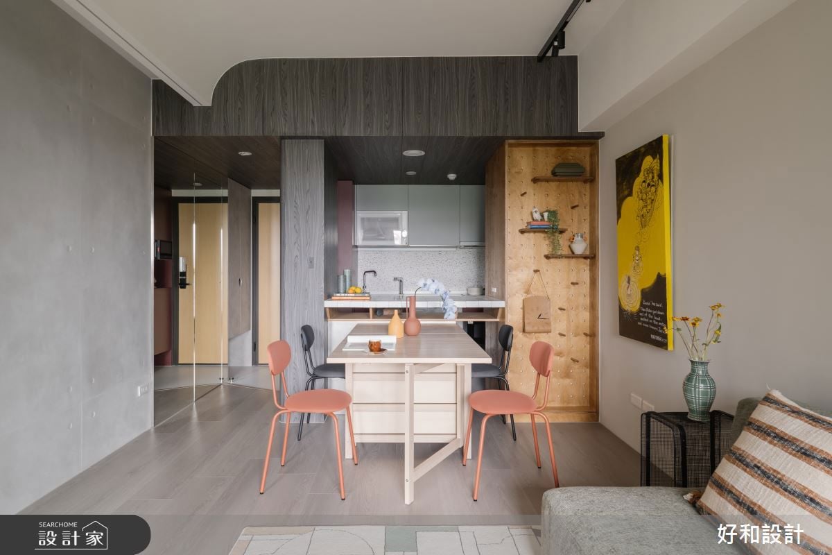 17 坪的預售屋,以「摩登復古」為核心,巧妙混搭大膽跳色與濃郁色彩。玄關廊道透過深色調與暗紅色鞋櫃的視覺衝擊,公領域櫥櫃以酒紅與白色的撞色對比,搭配深棕色木作營造出豐富的視覺層次。空間中捨棄了固定式束縛,靈活運用多樣化的活動家具。例如可隨心收合的摺疊餐桌,以及能根據親子需求調整的樺木染色洞洞板,不僅賦予了小坪數難能可貴的互動感,更展現了 MCM 精神中「機能隨形」的設計巧思。在復古 10X10 磁磚中島與復古燈具的點綴下,17 坪的空間不再侷促,而是一處充滿童趣且具備電影感濾鏡的摩登生活場域。