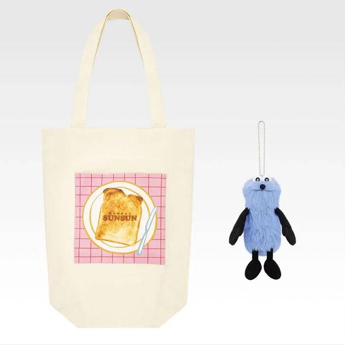 B賞則是百搭實用的托特包,包包的正中間有個大口袋設計,圖樣則是印著「SUNSUN」大字的烤吐司,最令人驚豔的是,這款托特包還會附上一款SUNSUN絨毛玩偶吊飾,讓你可以把SUNSUN吊飾掛在包包上,一起帶出門。