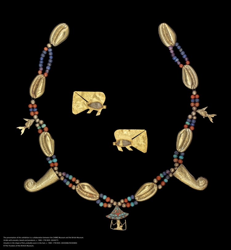 由護身符、珠子與墜飾組成的腰帶 + 可能是髮飾的魚形護身符,約西元前1985–1795年。(EA3077、EA30482、EA30483)圖片版權:大英博物館理事會