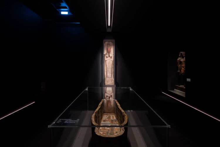 展場接著迎來主題二:「從神而來」,透過法老與神祇的關係,呈現法老如何以「眾神」之名取得統治的正當性。自古以來,法老的治權為神授而非民選,其統治合法性並非來自人民或貴族,而是源自神的旨意。在位期間,法老被視為荷魯斯(Horus)在人間的化身,死後,法老則與冥界之神歐西里斯(Osiris)合而為一,完成神格化。
