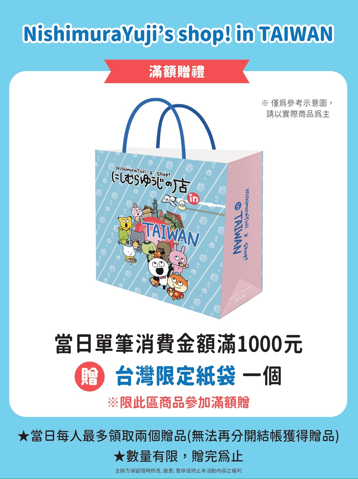 台北快閃第一彈受到好評的滿額贈台灣限定紙袋,活動當日購物滿1千元限量贈送。NishimuraYuji-西村優志-老師插畫作品,在2025年度榮獲台灣原創貼圖排行榜冠軍,社群網路SNS中常見網友分享,可愛的角色展現趣味的生動表情,謎樣肢體動作,饒富幽默感,和像極了某些時刻的自己那股親和力。西村老師觀察到台灣人情感表達直接,和其作品角色高度契合,很開心受到大家熱烈歡迎。