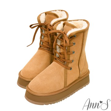 冬季靴款推薦5:Ann’S|溫暖甜美升級.防潑水鍍膜真皮澎毛2way綁帶厚底雪靴