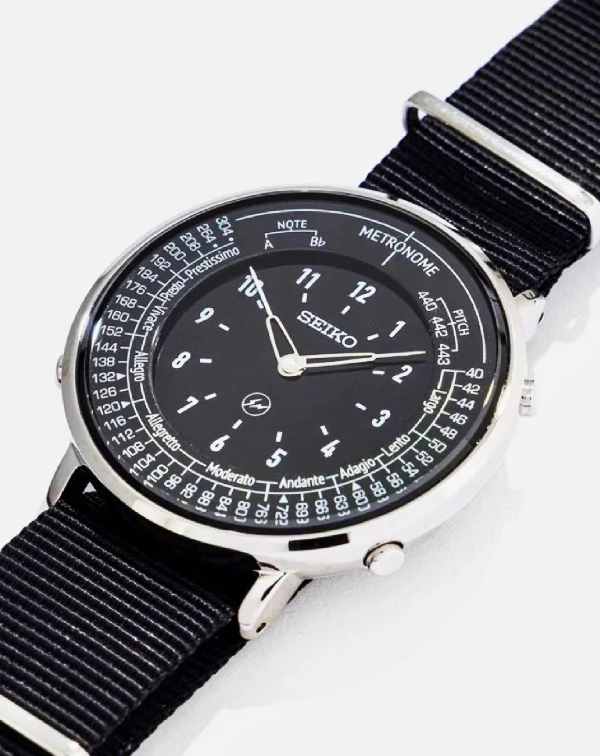 A:這款聯名腕錶最大的亮點在於,結合了Seiko經典的「音樂節拍器模式」。使用者按下8點鐘位置的按鈕,即可將腕錶切換為音樂功能模式。它不僅能發出標準音A4與Bb4提供調音基準,更支援每分鐘40至300拍的節拍設定,是專為音樂愛好者與創作者設計的「聽得見的時間」工具錶。