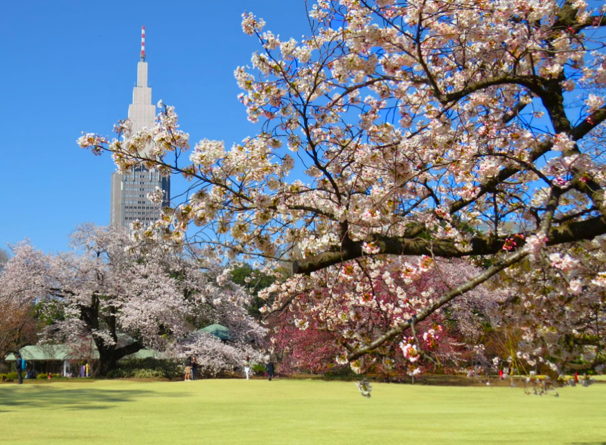 以高樓林立的都會景觀為背景,新宿御苑內約有 65 種、1,000 株櫻花接力綻放,是東京數一數二的賞櫻名所。
