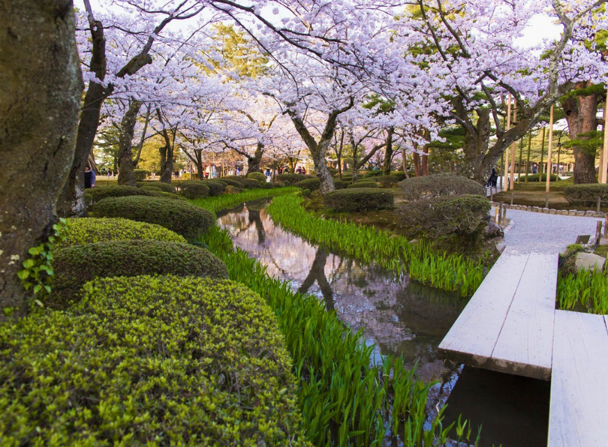 兼六園是江戶時代代表性的大名庭園,也被指定為國家特別名勝。櫻花季期間,常有限定免費開放或夜間點燈活動,夜櫻景色夢幻迷人。