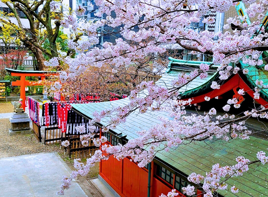 朱紅色鳥居與櫻花的對比非常上鏡,很適合在逛街途中順路停留、靜靜參拜。
