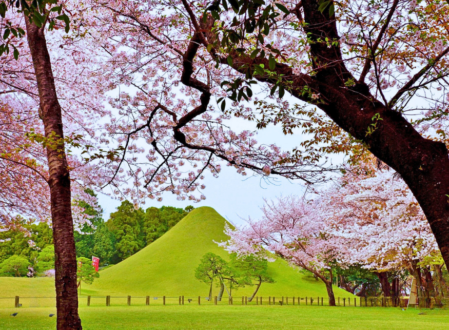 搭乘路面電車即可抵達的水前寺成趣園,是一座以富士山為意象的回遊式庭園,透過能樂堂與鳥居遠望櫻花,格外優雅。
