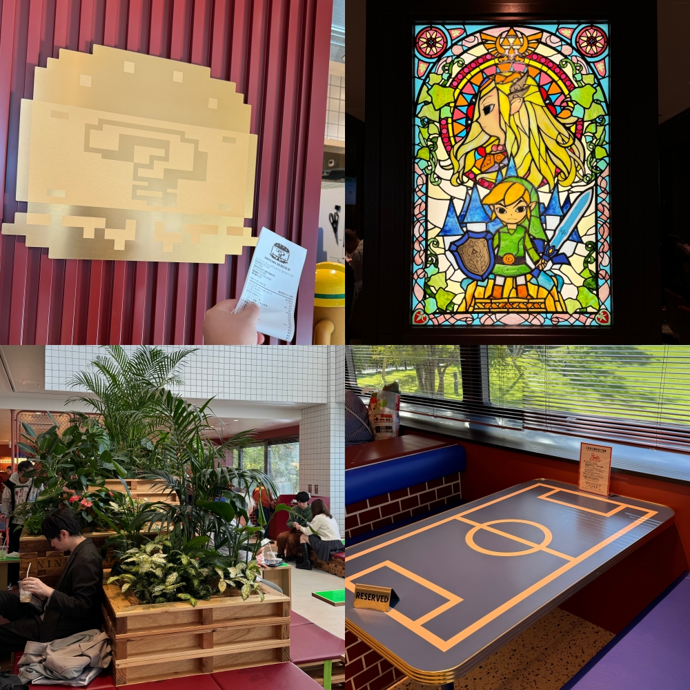 店內的裝潢融合了這片土地曾作為「任天堂工廠」時的元素,如將當時的棧板改造為長凳,加上一看就讓人興奮起來的那些熱門遊戲的相關符號,使得這個空間很不一樣。除此之外,伴隨著店內播放的經典遊戲音樂,非常適合與同行友人邊大快朵頤、邊互相分享剛才在展區或互動區所經歷的快樂與感動。