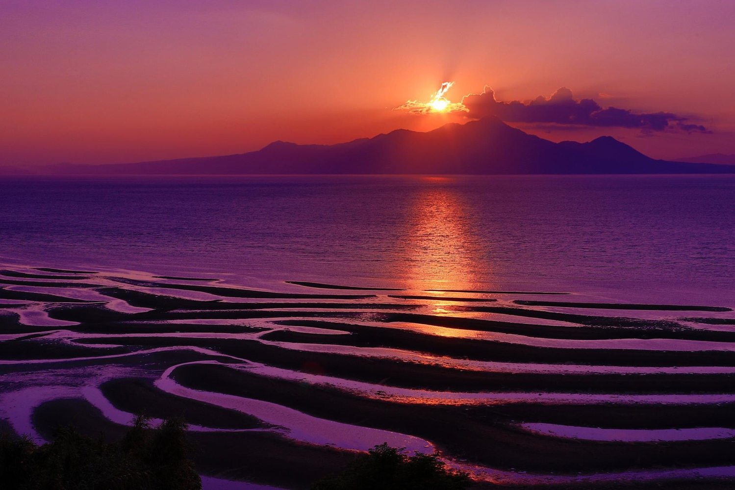 位於熊本的御輿來海岸,相傳是因景行天皇遠征九州時,見到此處的美景,忍不住停下來駐足欣賞,因此得名御輿來海岸。這裡同時還入選「日本沙洲百選」與「日本夕陽百選」,是一處知名的風景名勝。