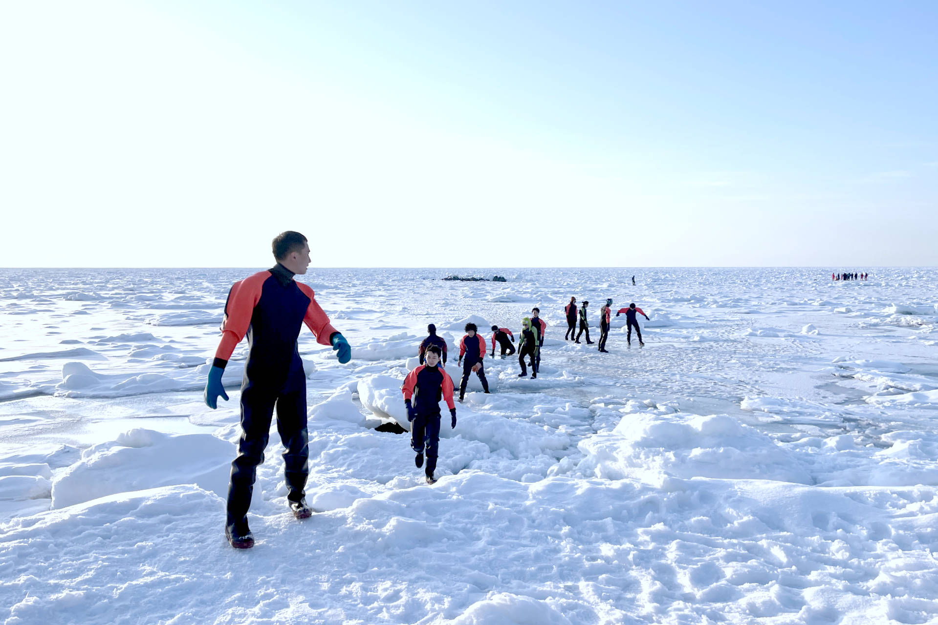 在這樣的知床海岸,我們可以體驗到特殊的流冰漫步活動,穿上由當地業者提供的專用防寒衣,並讓當地的資深嚮導帶領踏上流冰,甚至是跳破流冰,一起體驗北海道獨特的冬季風物詩吧。